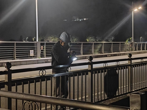 清江公司隔河巖電廠青年員工穆引濤汛期在凌晨巡檢大壩表孔泄洪情況(梁文岳 攝)